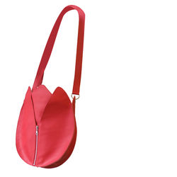 Handtas met cirkelbodem, verstelbare schouderband/handvat dmv knopen. In rood en zwart in voorraad, andere kleuren te bestellen.